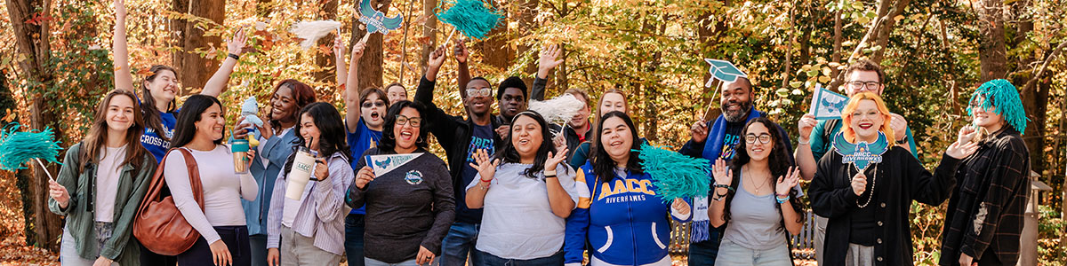 AACC entrance sign, AACC cheerleaders, AACC students walking in quad, students in various classroom settings like health lab, art studio, and classroom with instructors, AACC student doing sign language, drone shot of entire AACC campus.